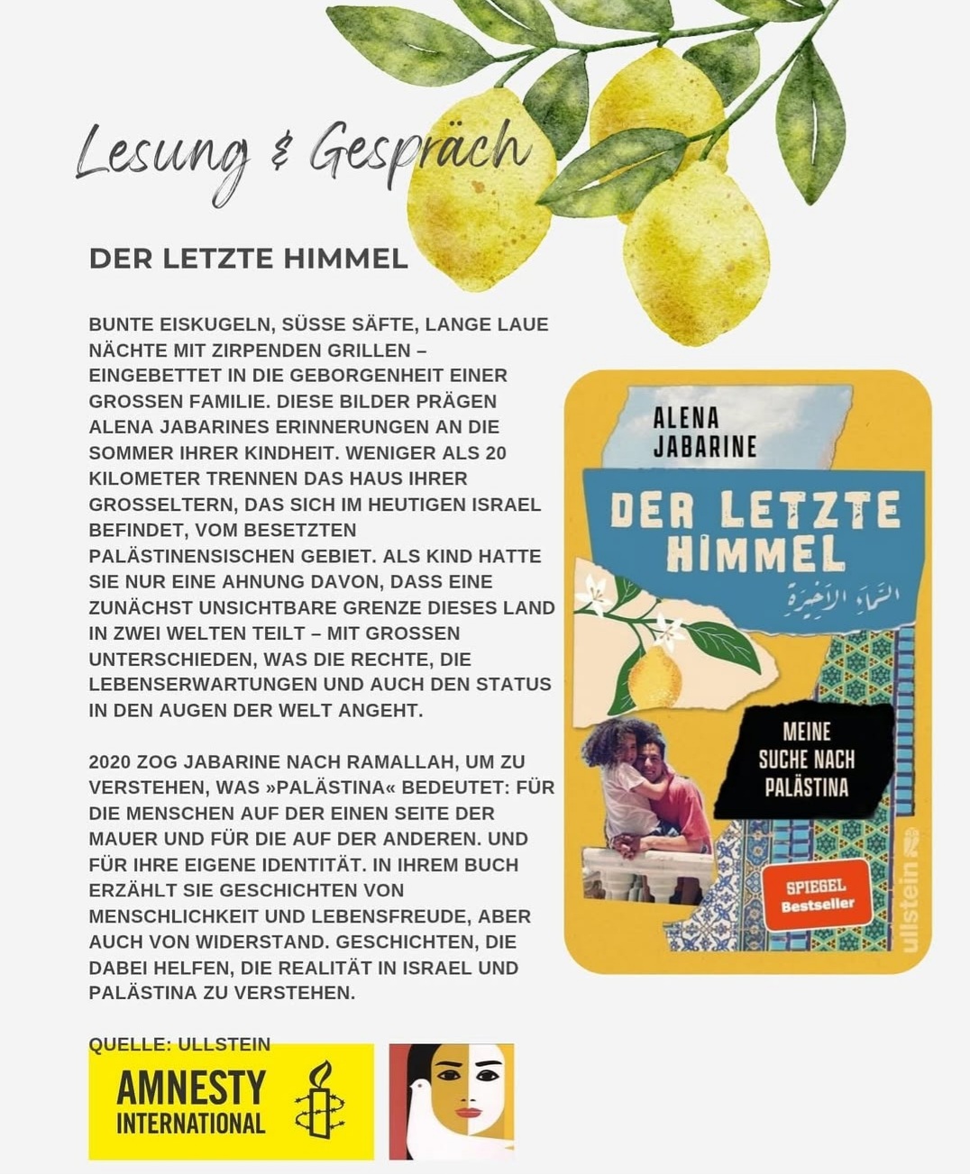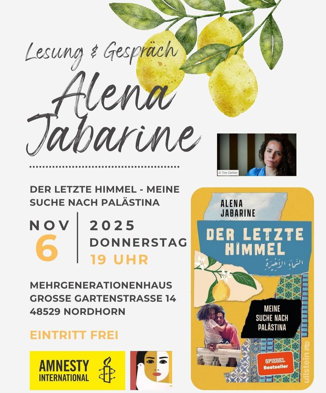 Am 06. November um 19 Uhr kommt Alena Jabarine zu uns nach Nordhorn und liest aus ihrem Buch „Der letzte Himmel – Meine Suche nach Palästina“. In ihrem Buch zeichnet sie ein eindrückliches Bild des Lebens in der Stadt Ramallah im Westjordanland. Ihre Erzählungen berichten von gegenseitiger Unterstützung und Gemeinschaft – auch über politische und ethnische Grenzen hinweg. Gleichzeitig offenbaren sie die alltägliche strukturelle Gewalt und Unterdrückung, mit denen Palästinenser*innen in den besetzten Gebieten konfrontiert sind. Nach der Lesung freuen wir uns auf ein anregendes Gespräch mit der Autorin.